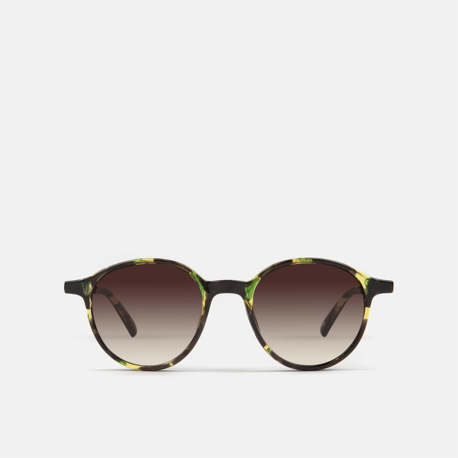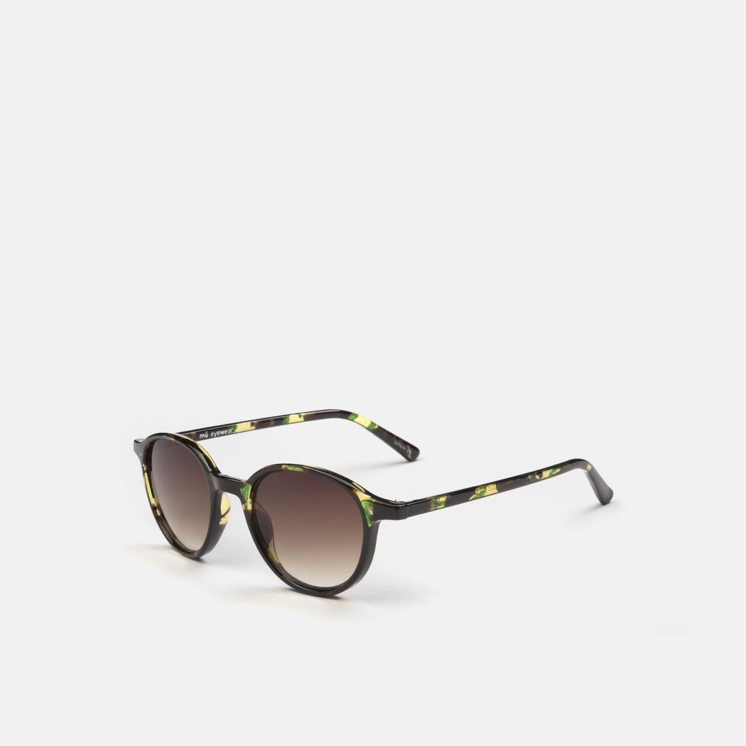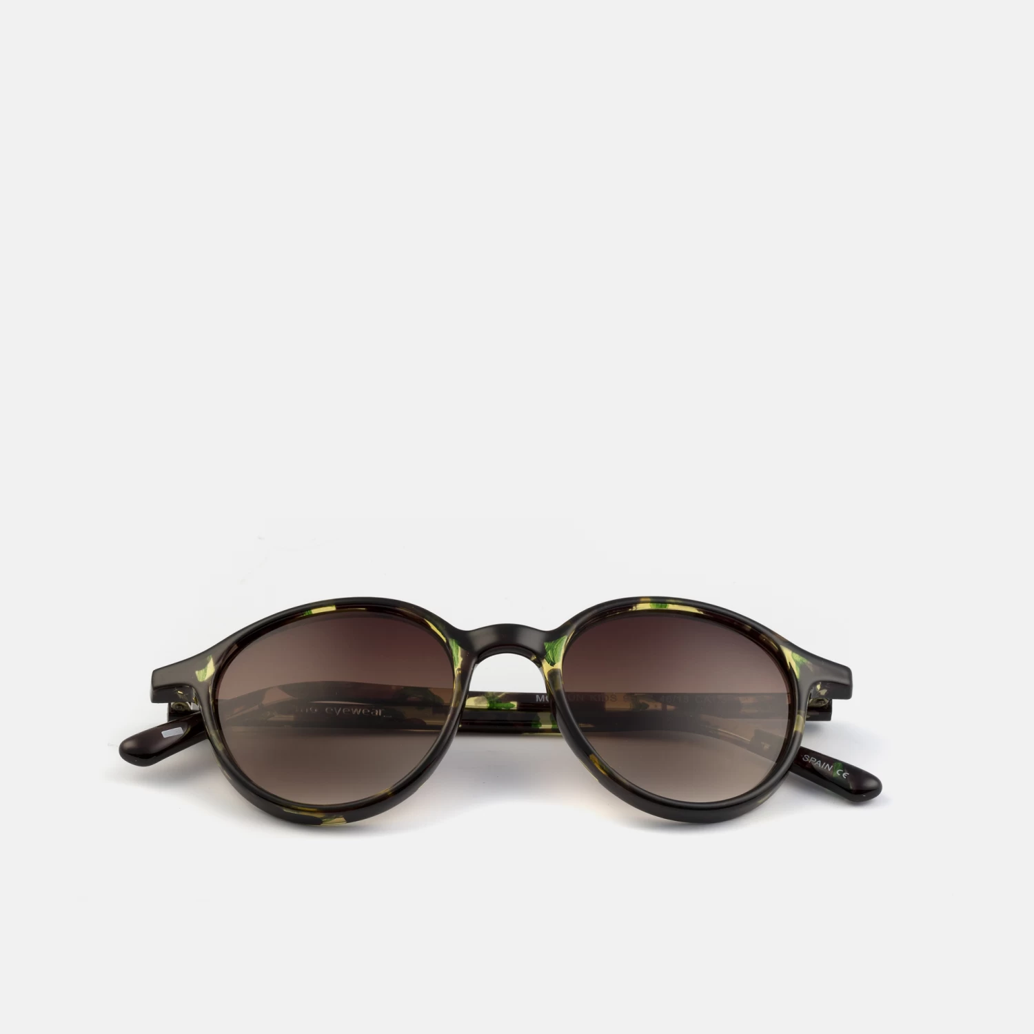 Gafas de sol para niños, con silueta redonda, de pasta carey con toques verdes y lente degradada marrón.