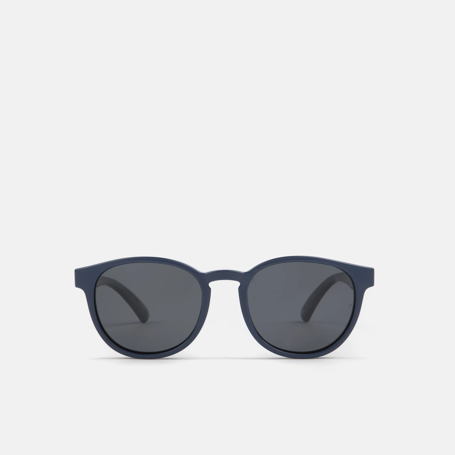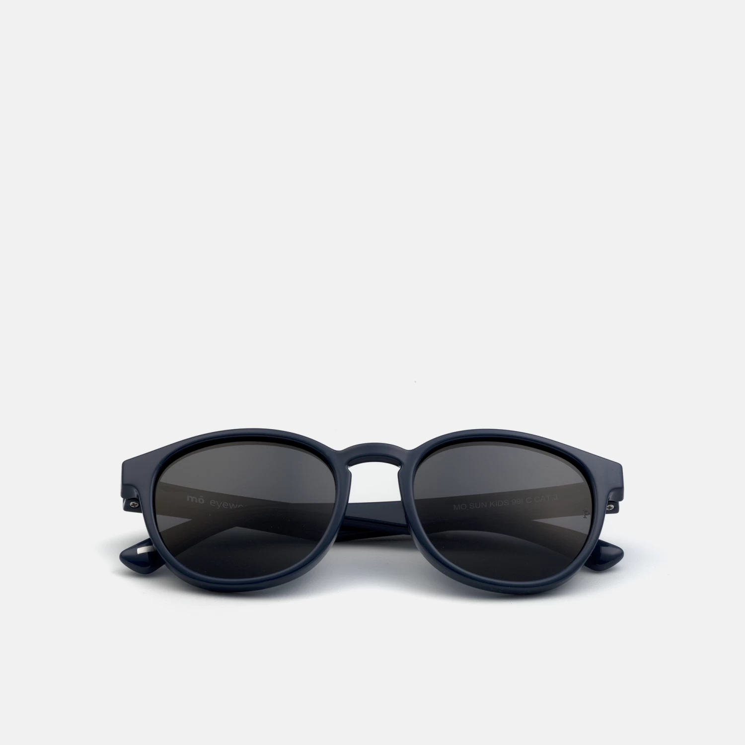 Gafas de sol para niños, con forma redonda y puente en herradura, de caucho azul. Su lente es polarizada.