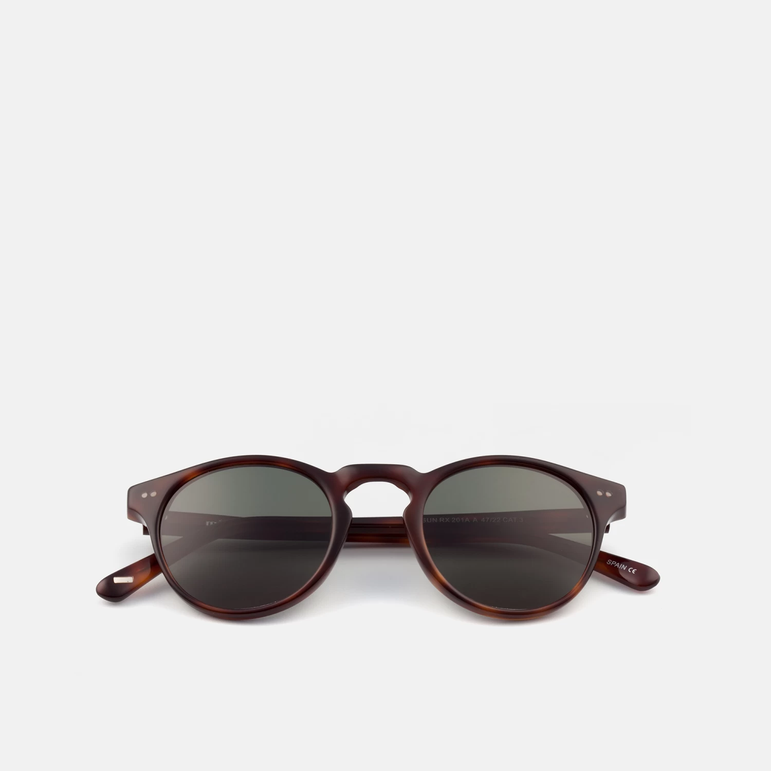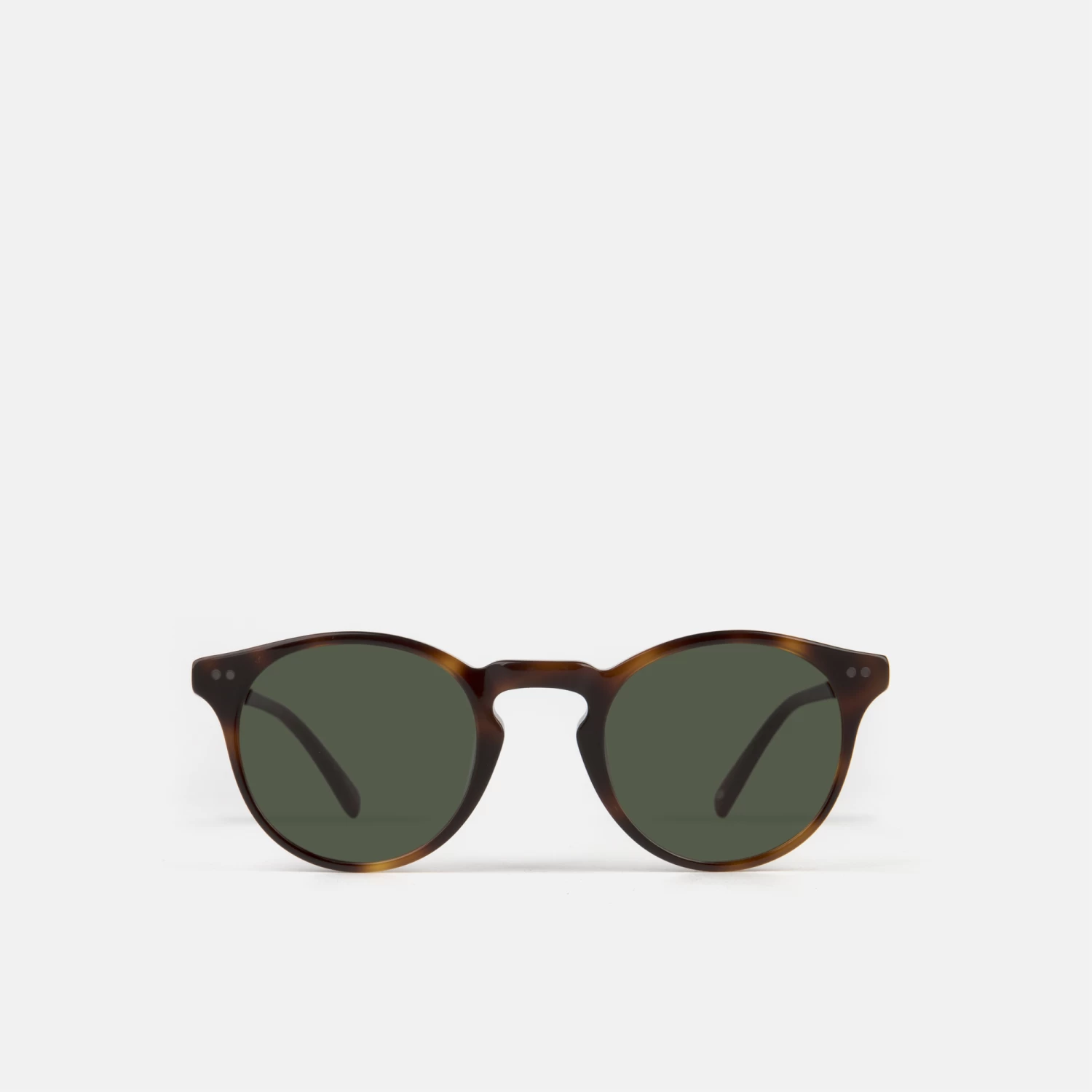 Gafas de sol unisex, con forma redonda y puente en herradura, de pasta en color habana y lente verde. Tiene decoraciones metálicas en ambos extremos del frente.