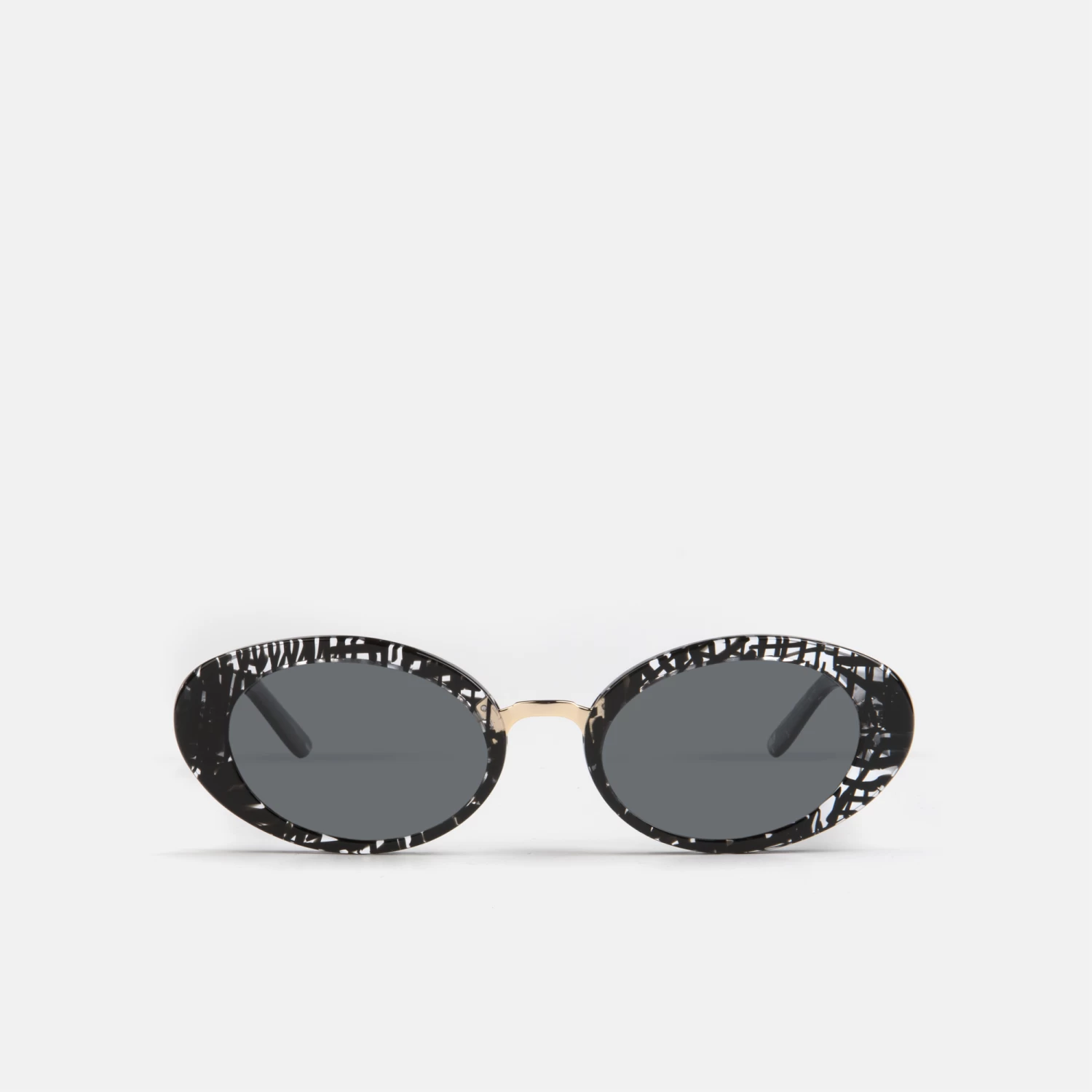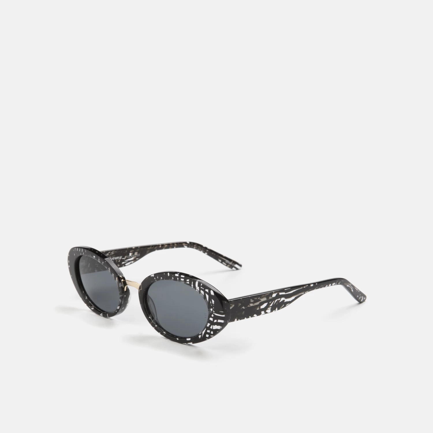 Gafas para mujer, con forma ovalada, fabricadas en acetato en color negro con detalles transparentes y puente de metal en color dorado. Tiene lentes solares polarizadasen color gris.