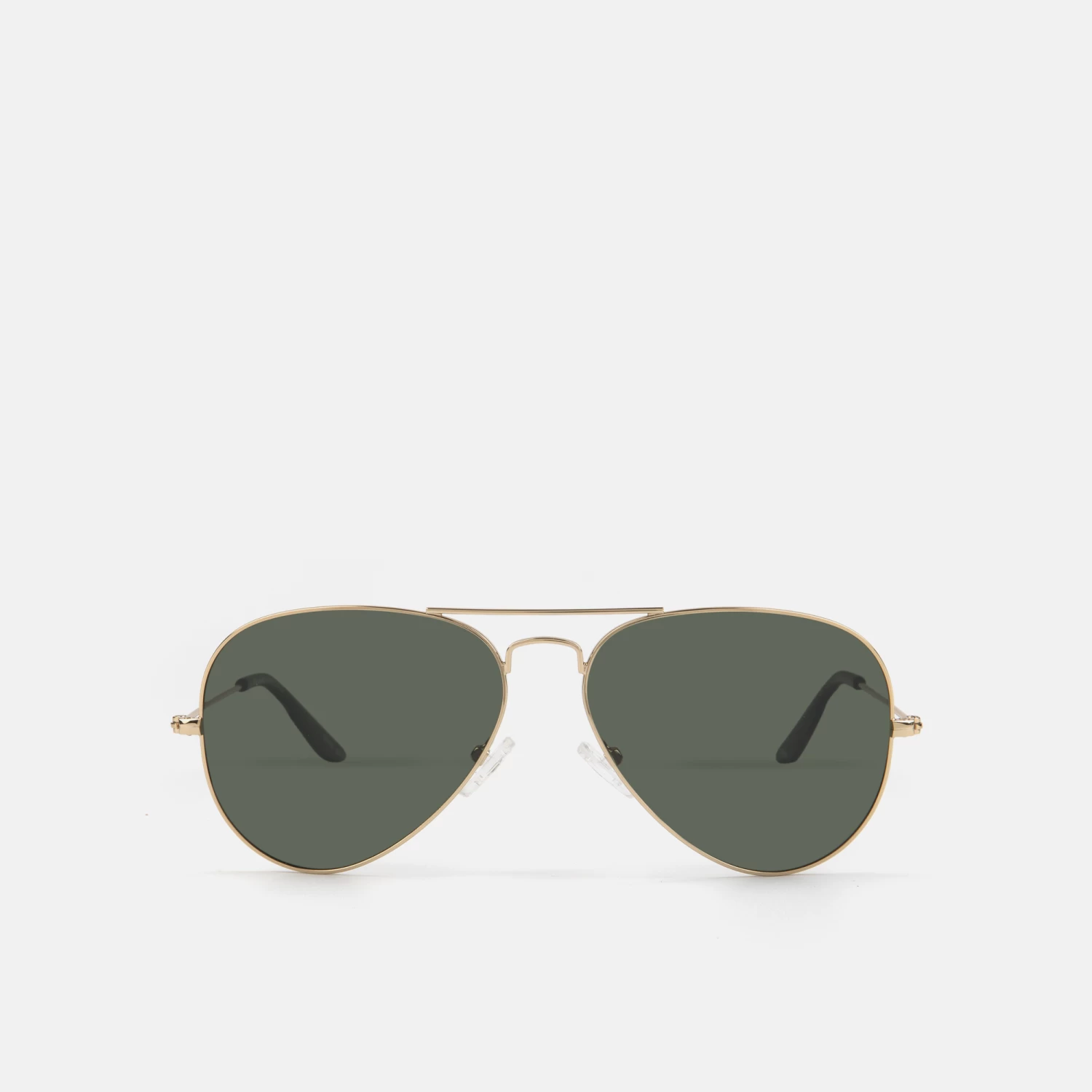Gafas estilo aviador, fabricadas en metal colordorado y lentes polarizadas color verde.