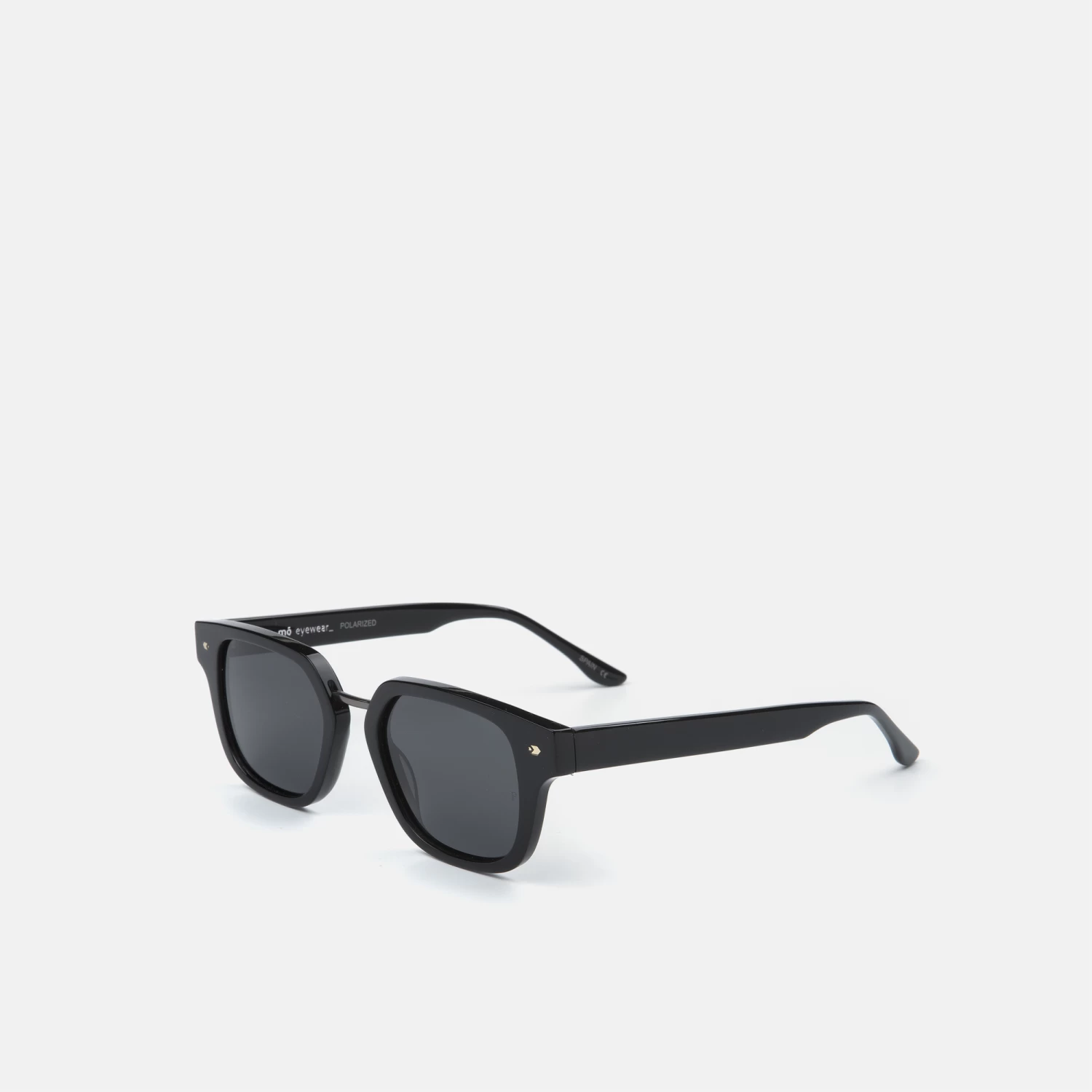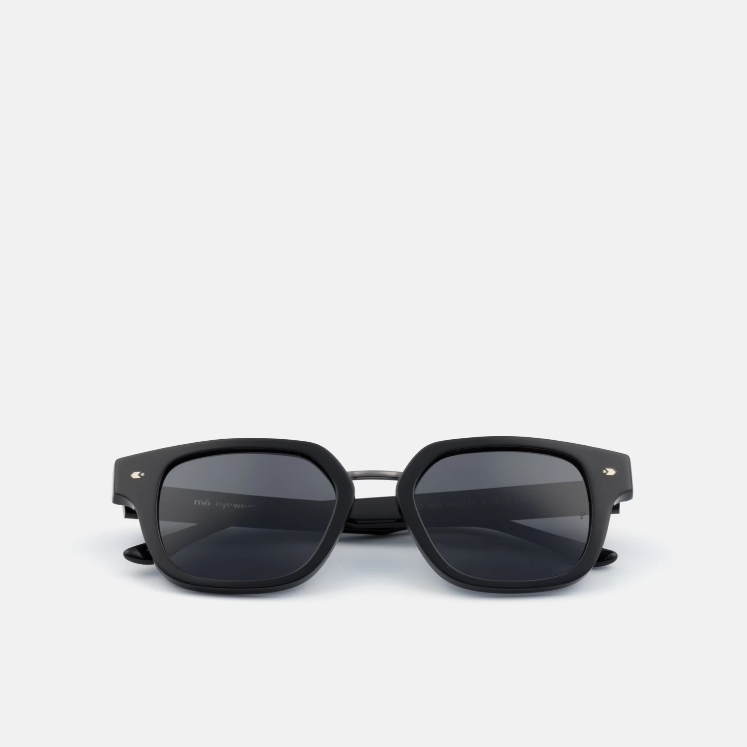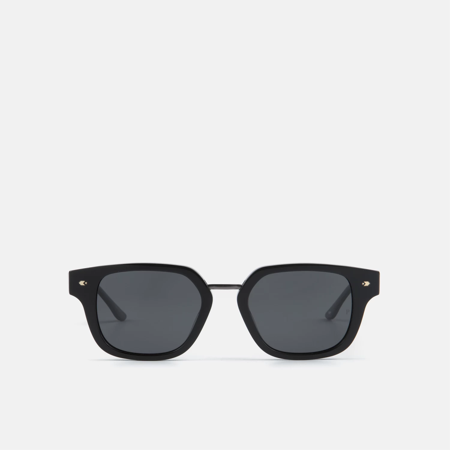 Gafas de sol con forma geométrica, fabricadas en acetato negro con puente y decoraciones de metal. Su lente es gris polarizada.