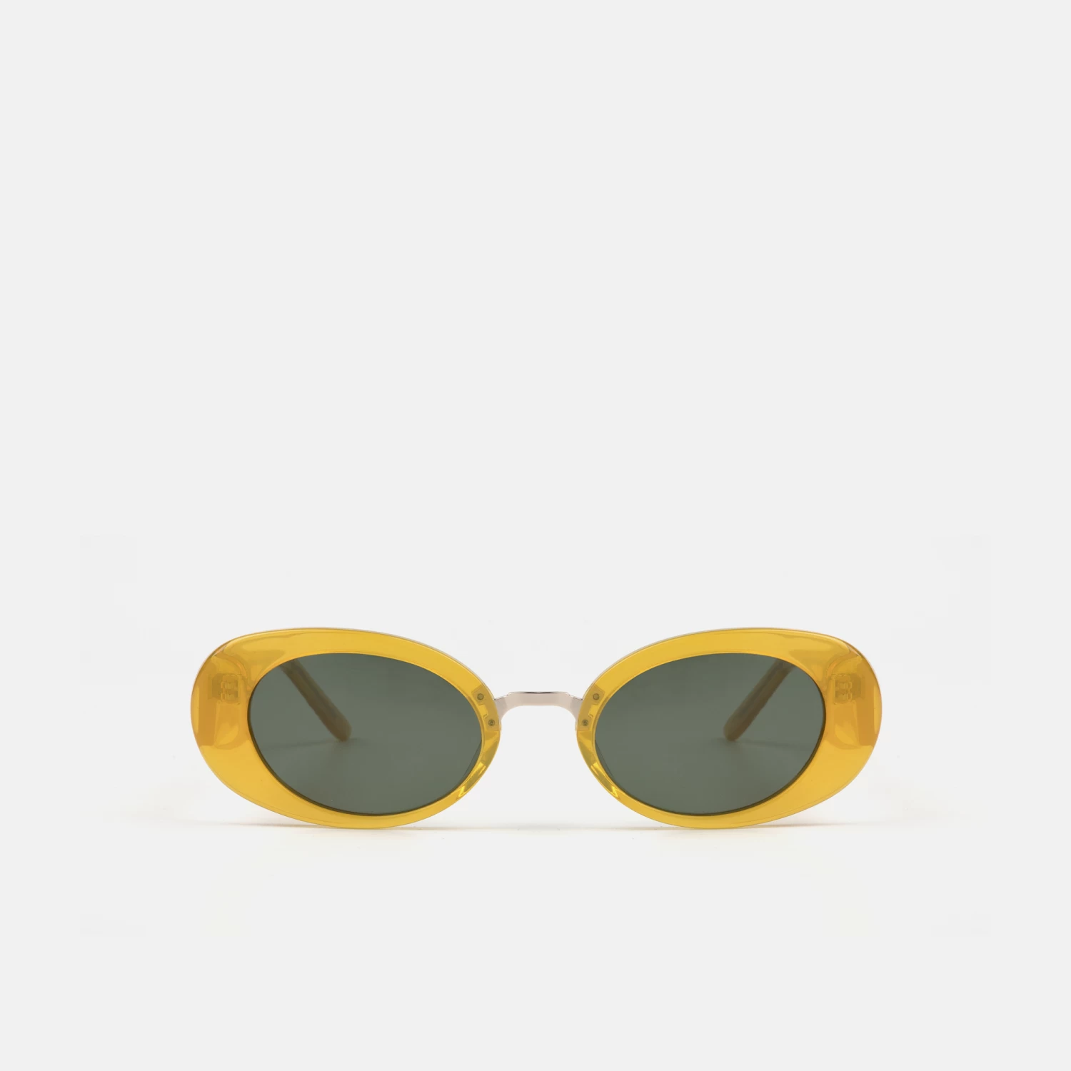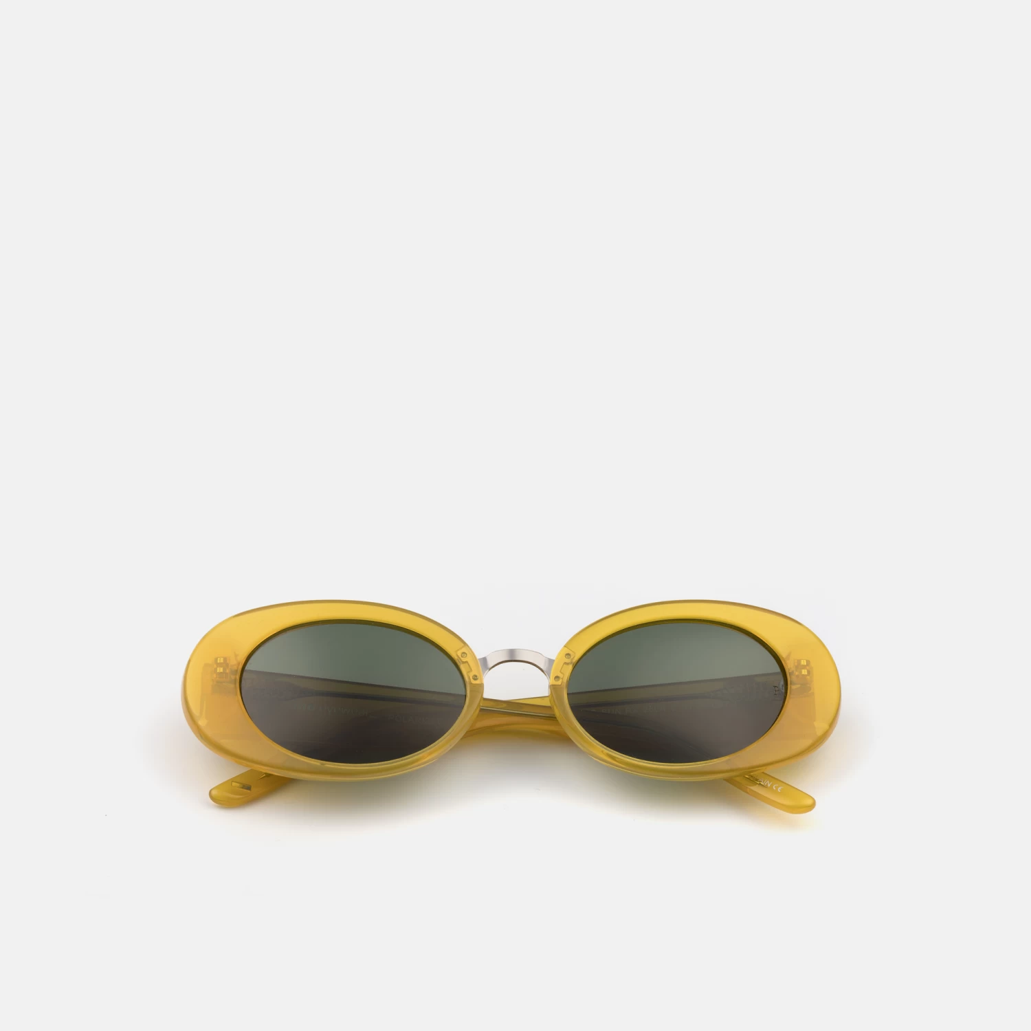 Gafas de sol con forma ovalada, de acetato amarillo y lente verde polarizada.