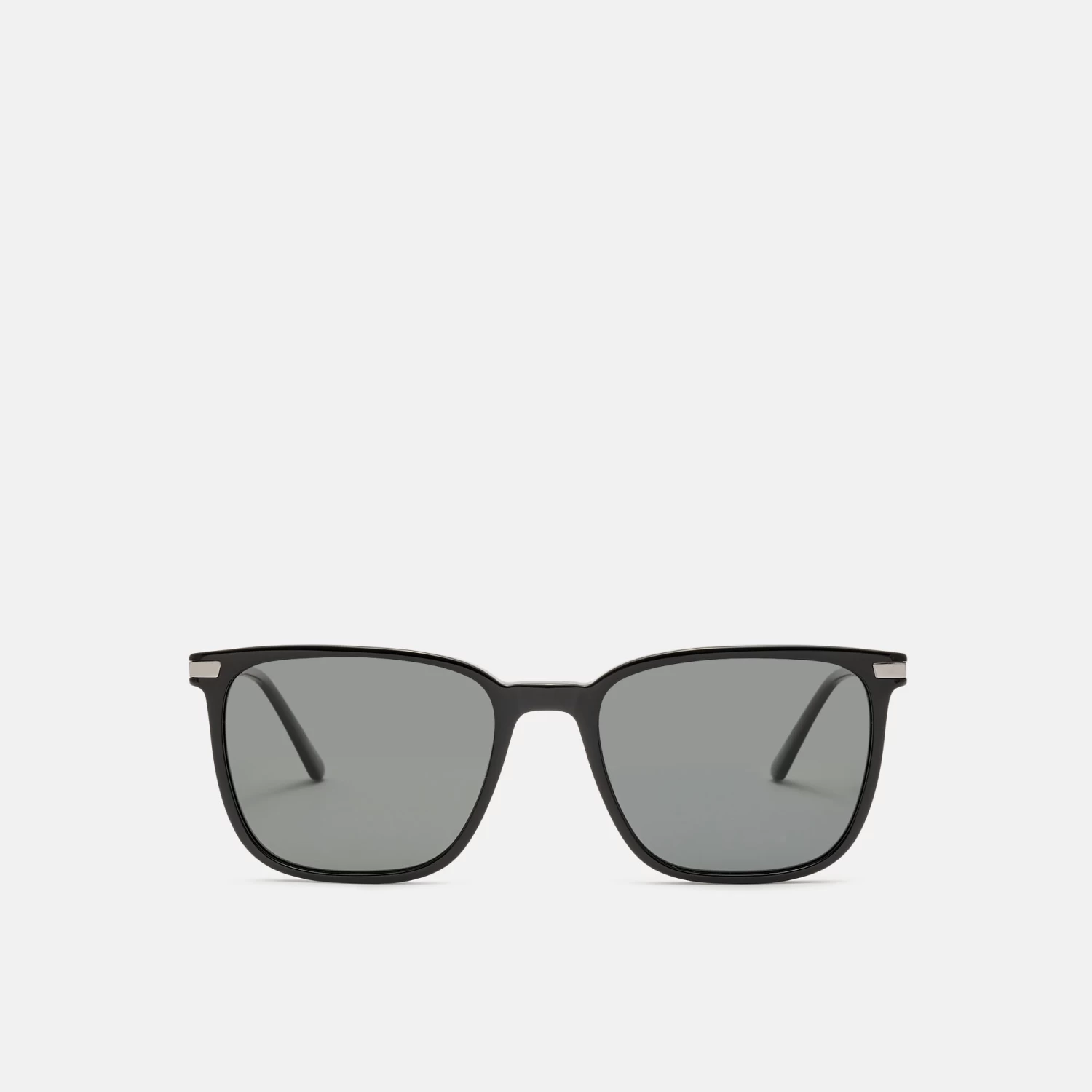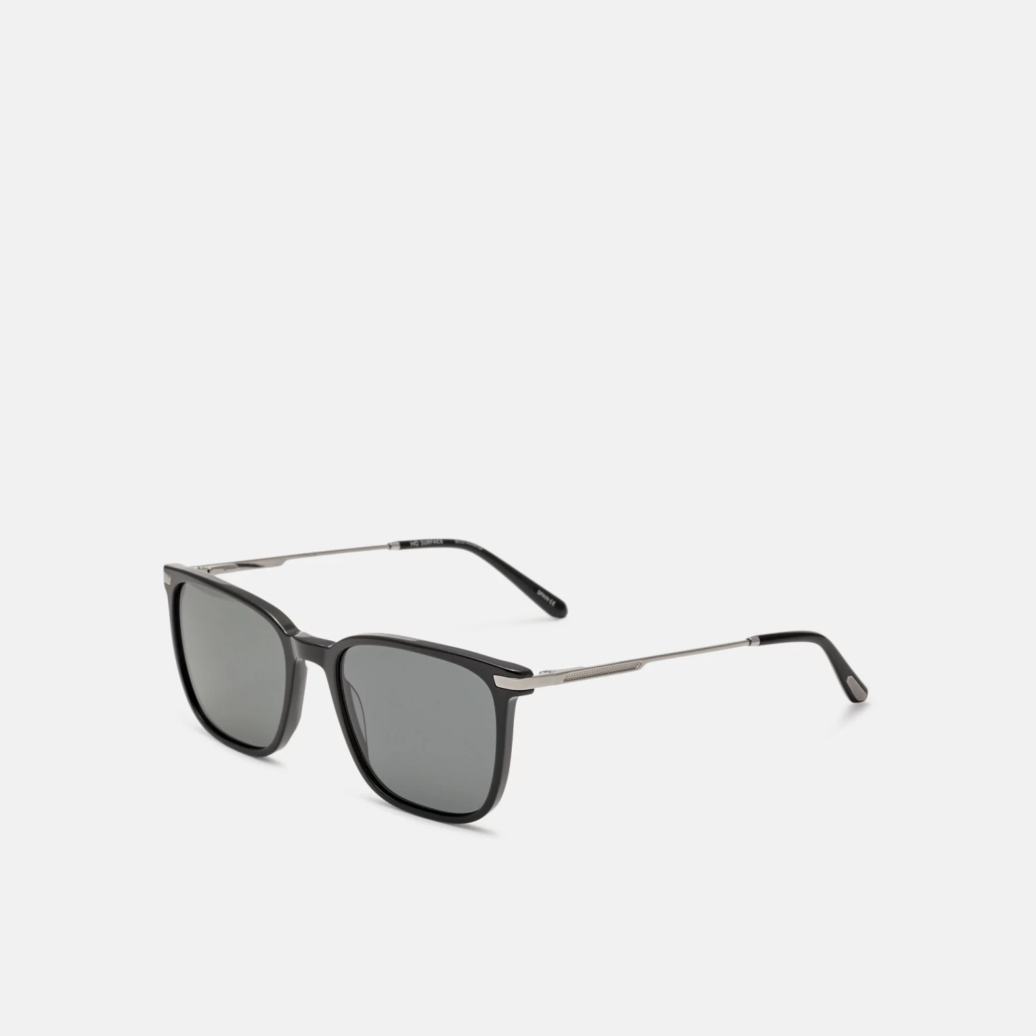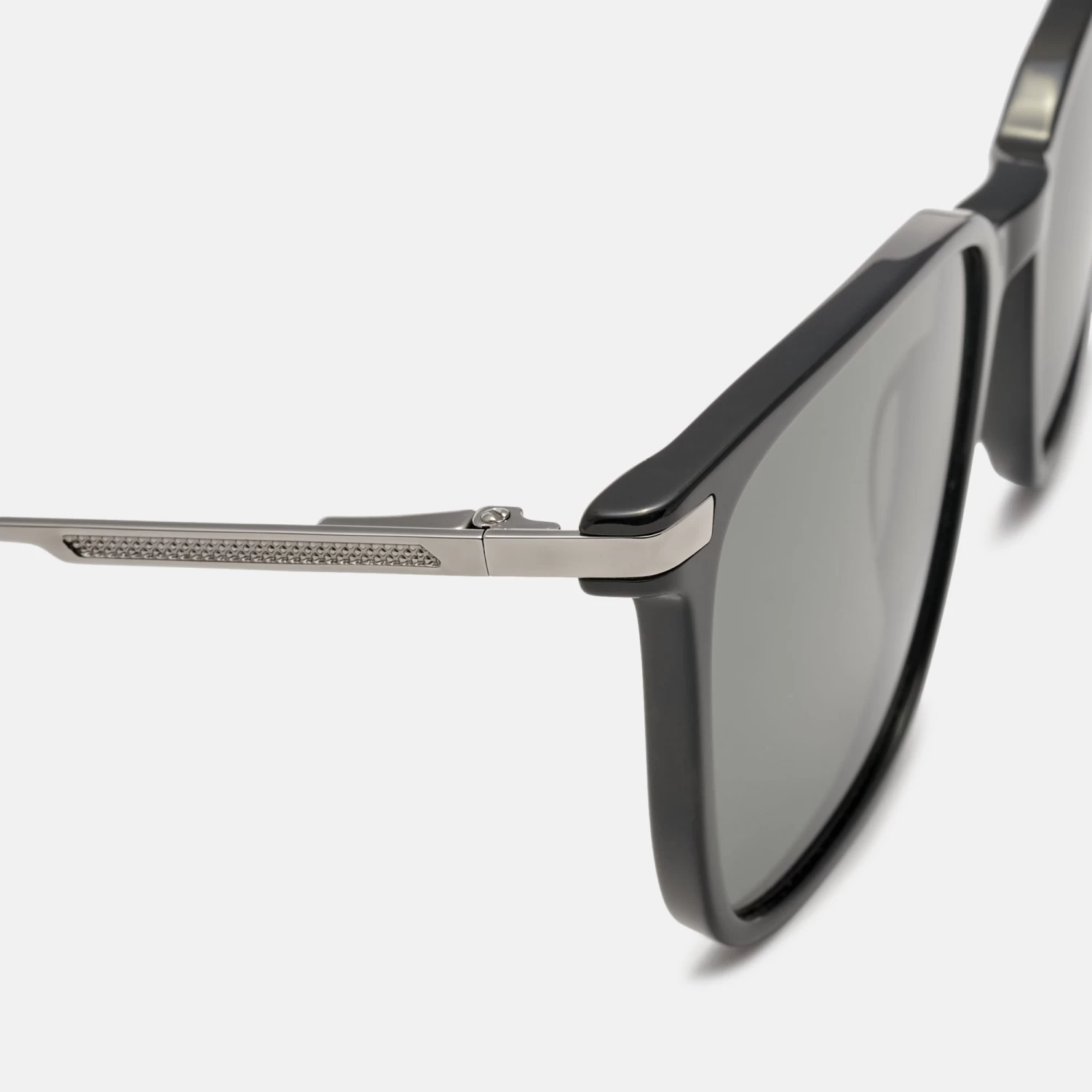 Gafas de sol para hombre, con forma cuadrada, de acetato negro. La varilla de metal cuenta con relieve texturizado, que aporta un toque más sofisticado. Sus lentes grises de alta calidad, son polarizadas para una mayor protección y confort.