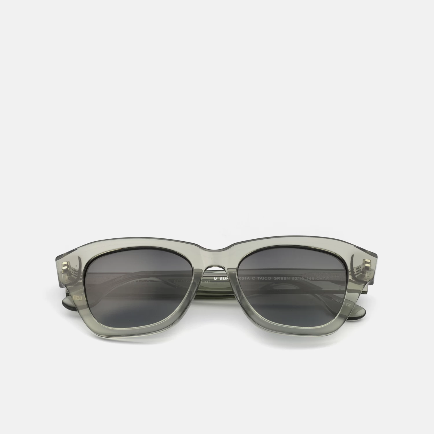 Gafas de sol unisex, de silueta geométrica, en acetato de color verde, con una forma atrevida aportando gran personalidad. Sus lentes polarizadas proporcionan una visión más nítida y un mejor contraste. s nítida y un mejor contraste.