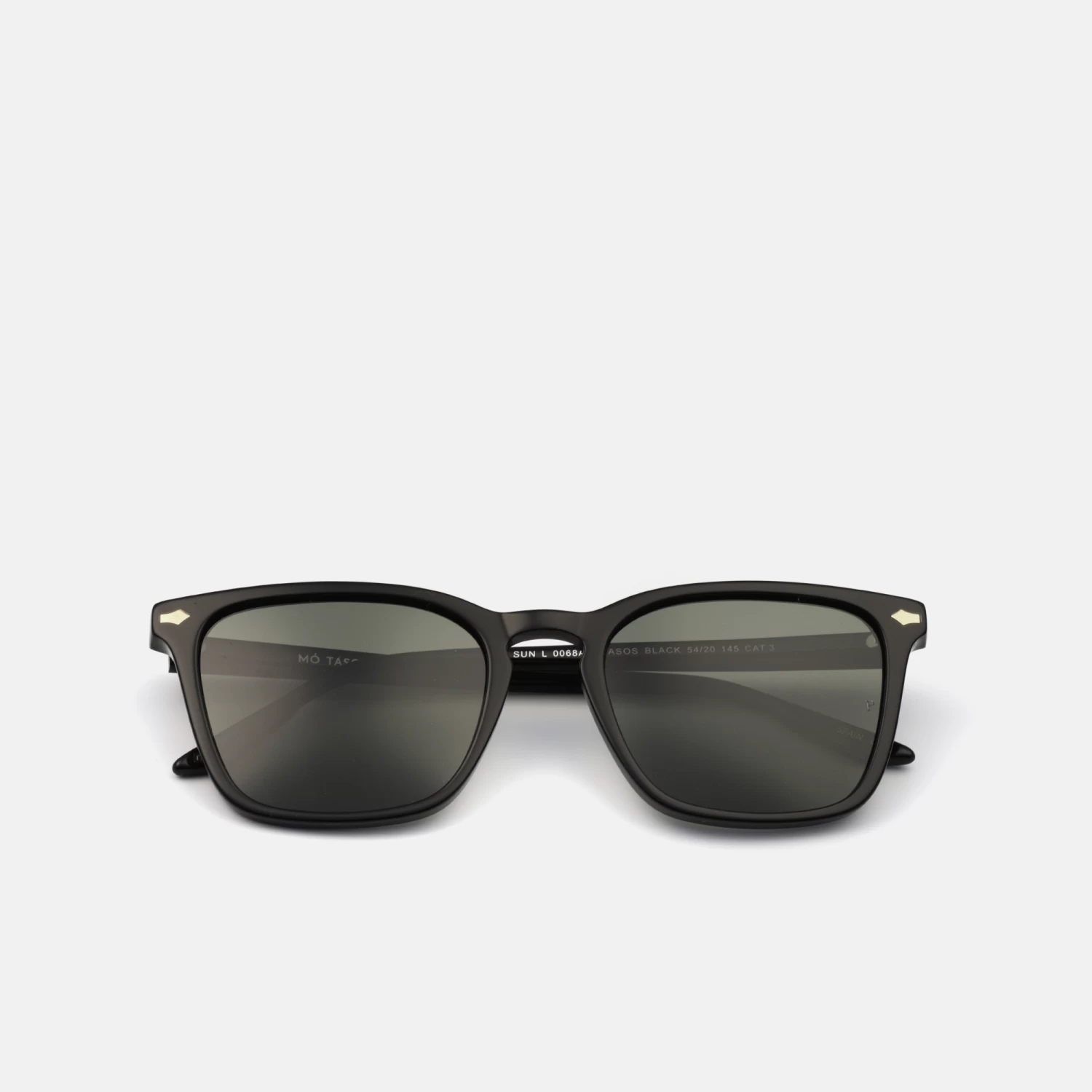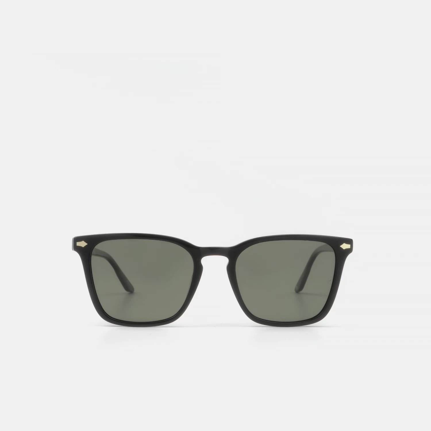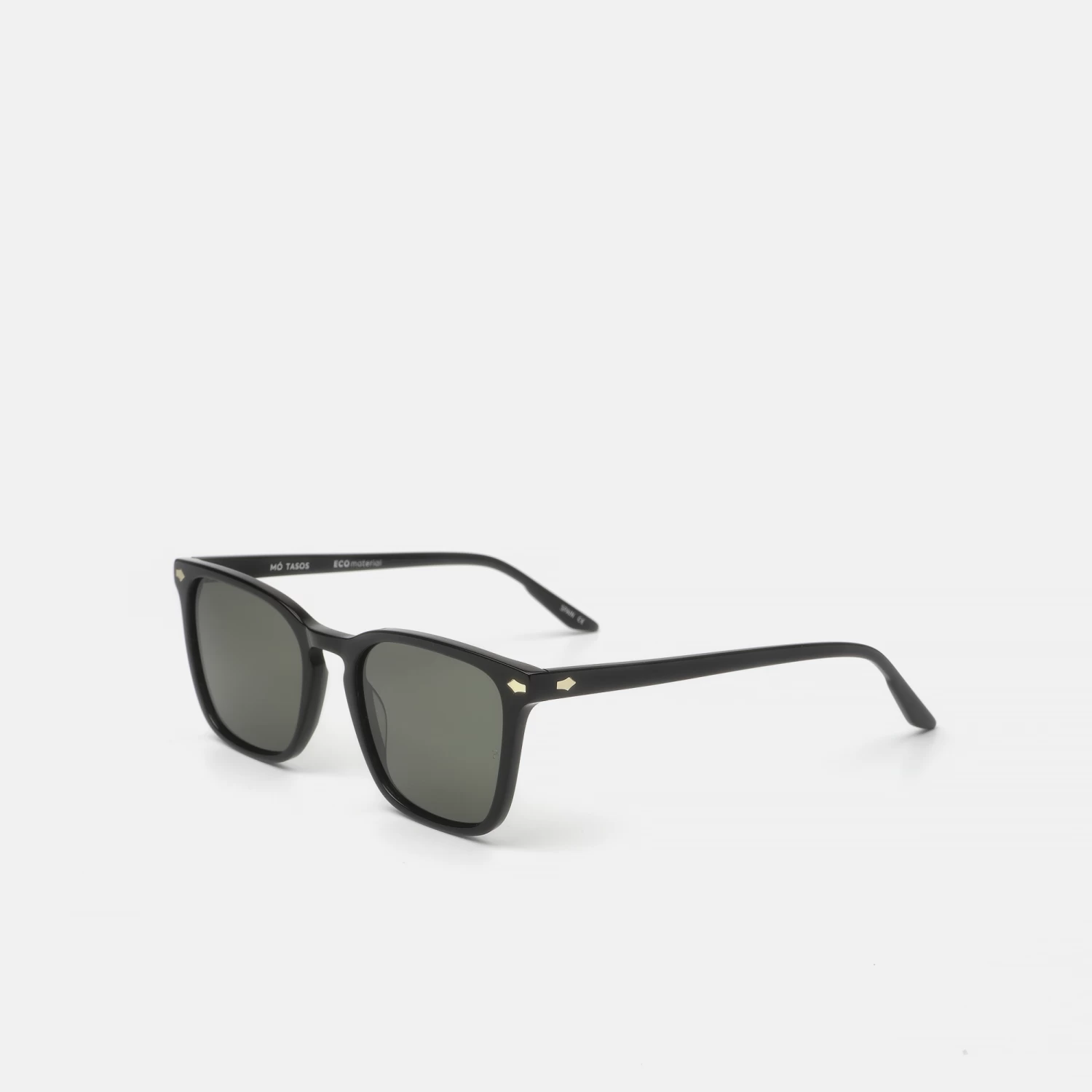 Gafas para hombre de forma cuadrada en acetato de color negro con detalle de metal color dorado en frente y varilla. Lentes color verdes polarizadas.