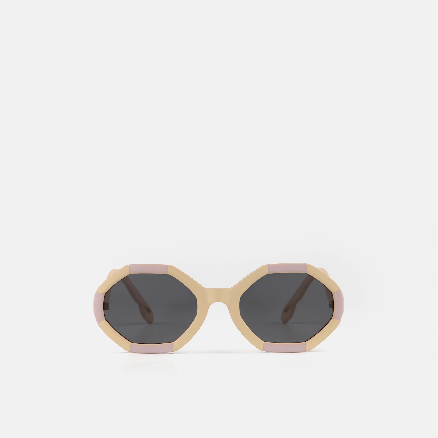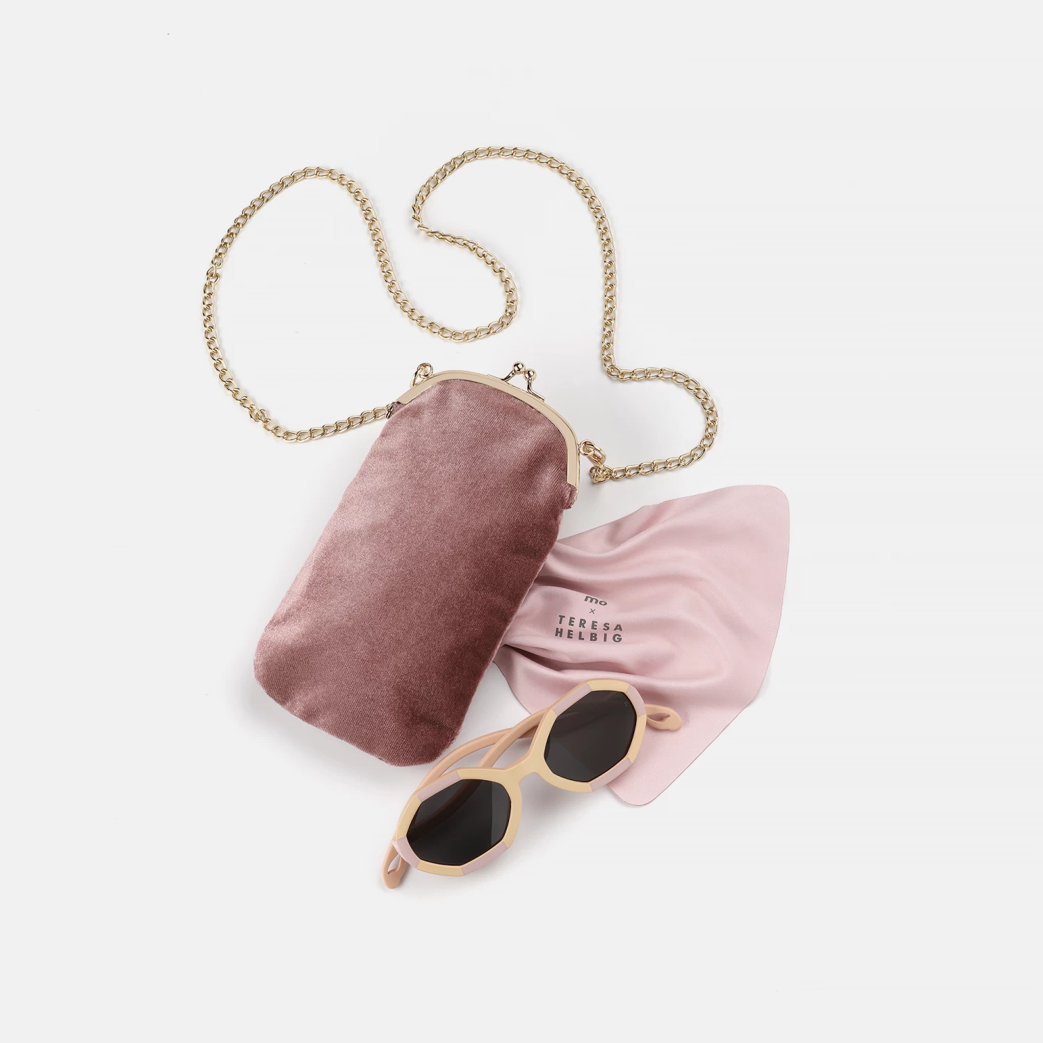 Fabricada en inyectado bicolor beige y rosa. El pack que acompaña a MO DREW, la gafa «petite» de la colección es un estuche tipo limosnera en acabado terciopelo rosa y con un estampado interior original a juego con la colección de Teresa HelbigEl pack consta de un estuche blando con cadena larga extraíble, un tarjetón y una gamuza a juego.