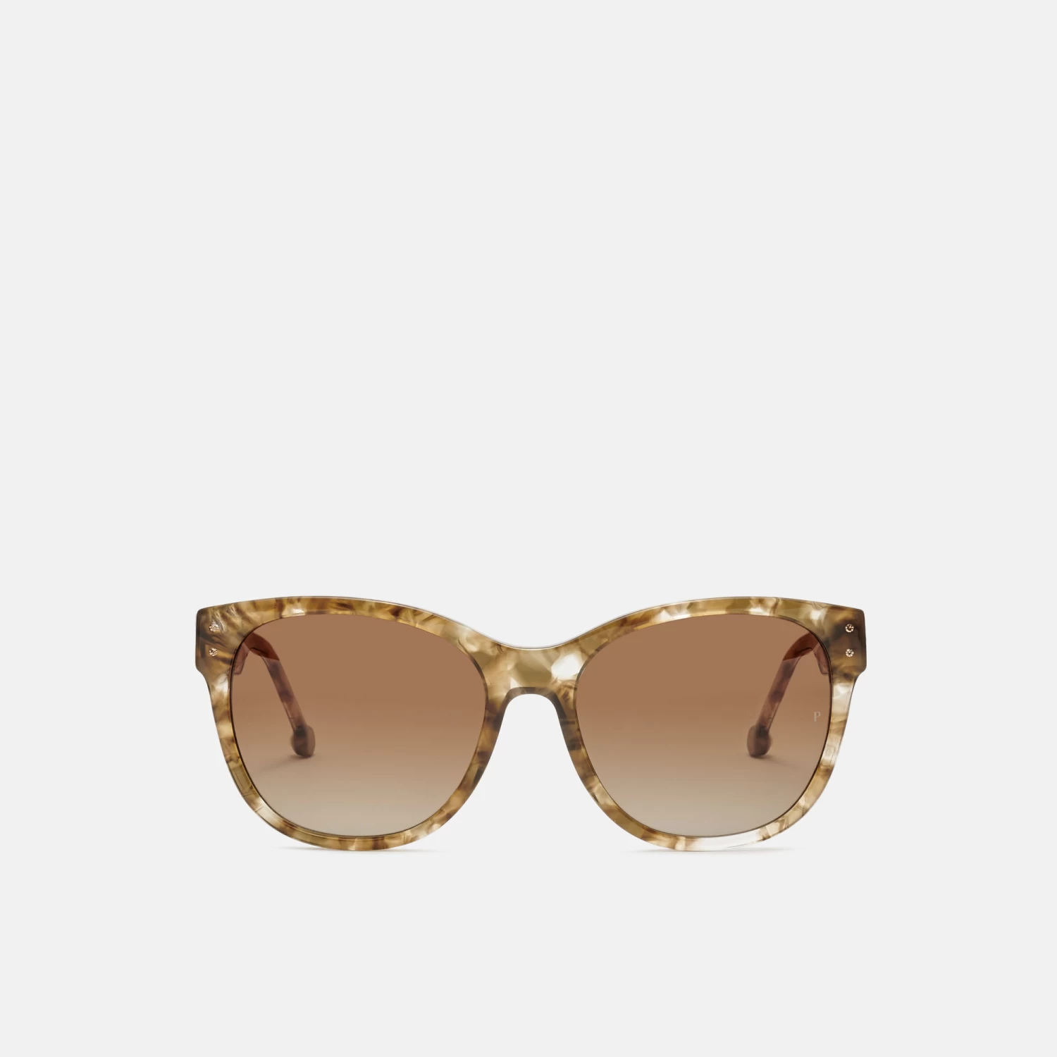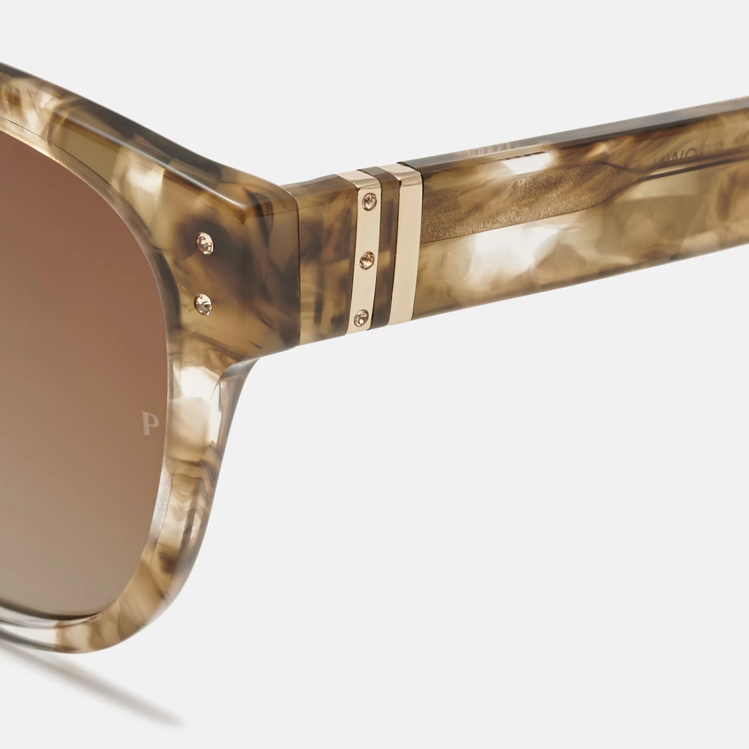 Gafas de sol para mujer, con forma redonda, en acetato marrón veteado. El frente y varilla cuentan con piezas metálicas en relieve y brillo, que aportan un toque más sofisticado. Sus lentes marrones degradadas de alta calidad, son polarizadas para una protección y confort.
