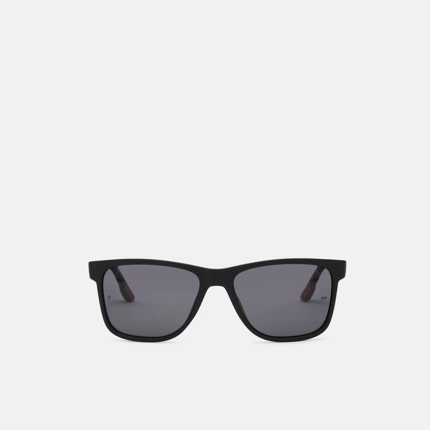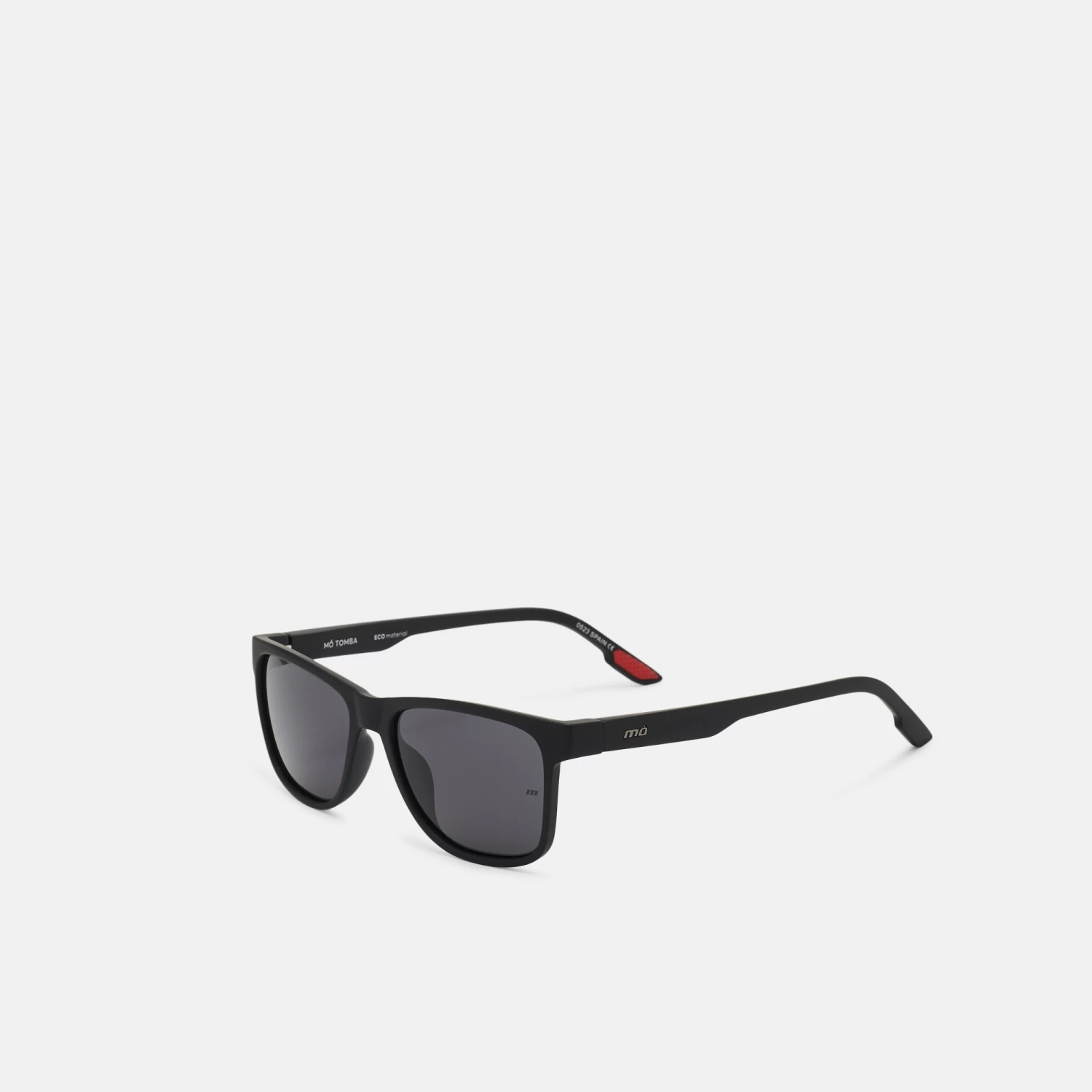 Gafas de sol con forma cuadrada, de material ECO G850 negro que ofrece una gran resistencia y ligereza. Además, sus detalles engomados color rojo aportan una mayor comodidad y sujeción. Sus lentes grises de alta calidad son polarizadas para una mejor protección, asegurando una experiencia cómoda y segura para tus ojos.