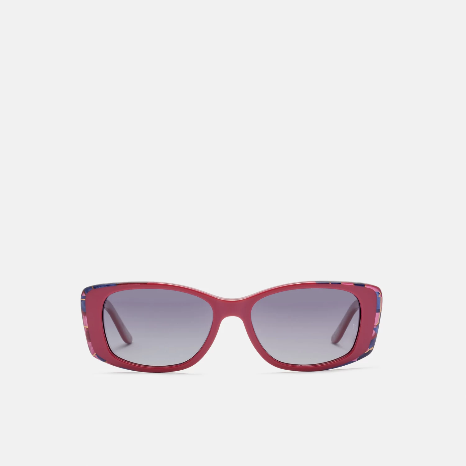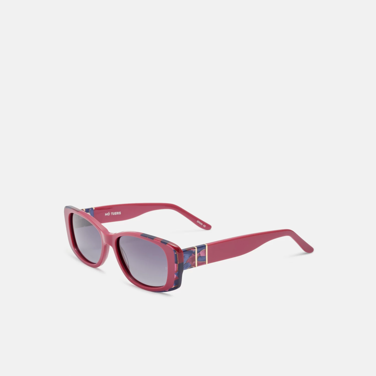 Gafas de sol para mujer, con forma rectangular , en acetato rosa con contrastes de acetato marmolado en los bordes frontales y en las varillas, y decoradas con detalles metálicos dorados.