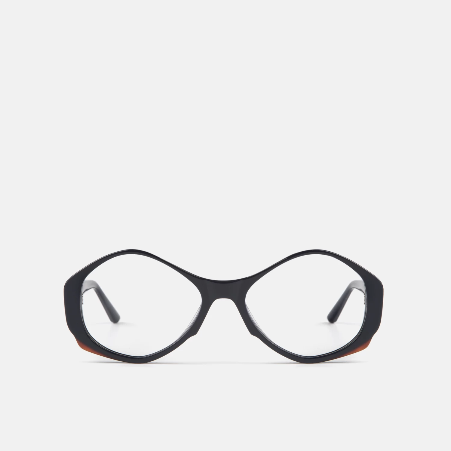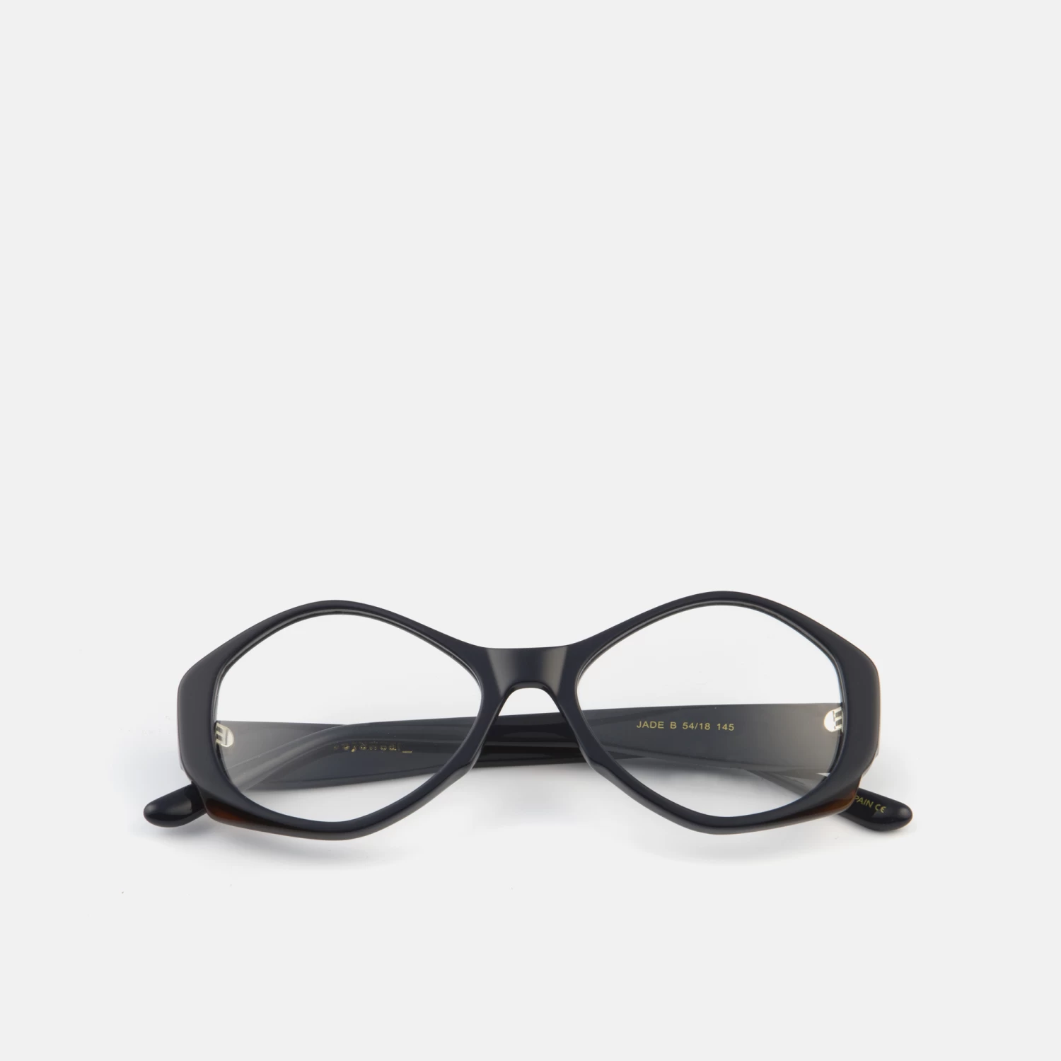 Gafas unisex, con forma geométrica, fabricadas en acetato en color azul oscuro con detalle de laminación en marrón en ambos extremos del frente.