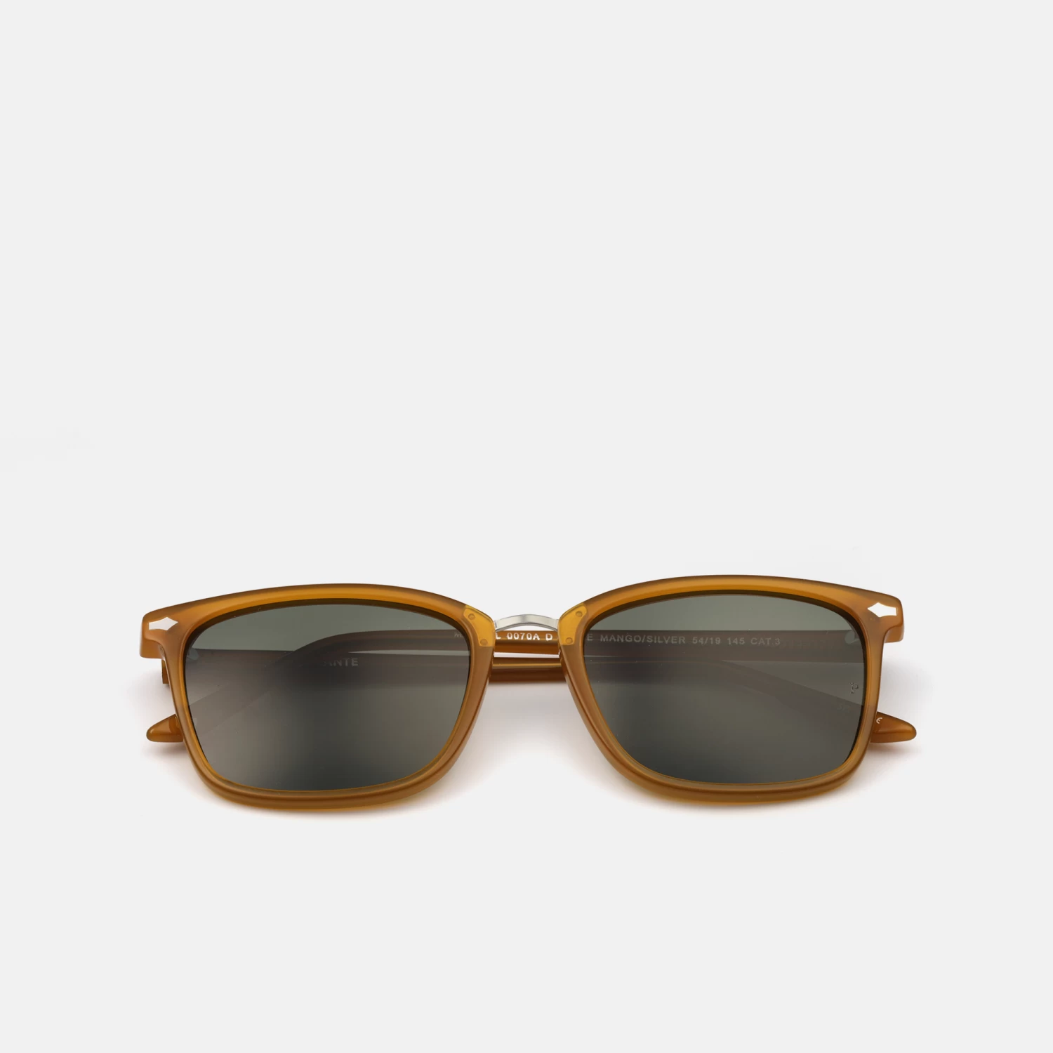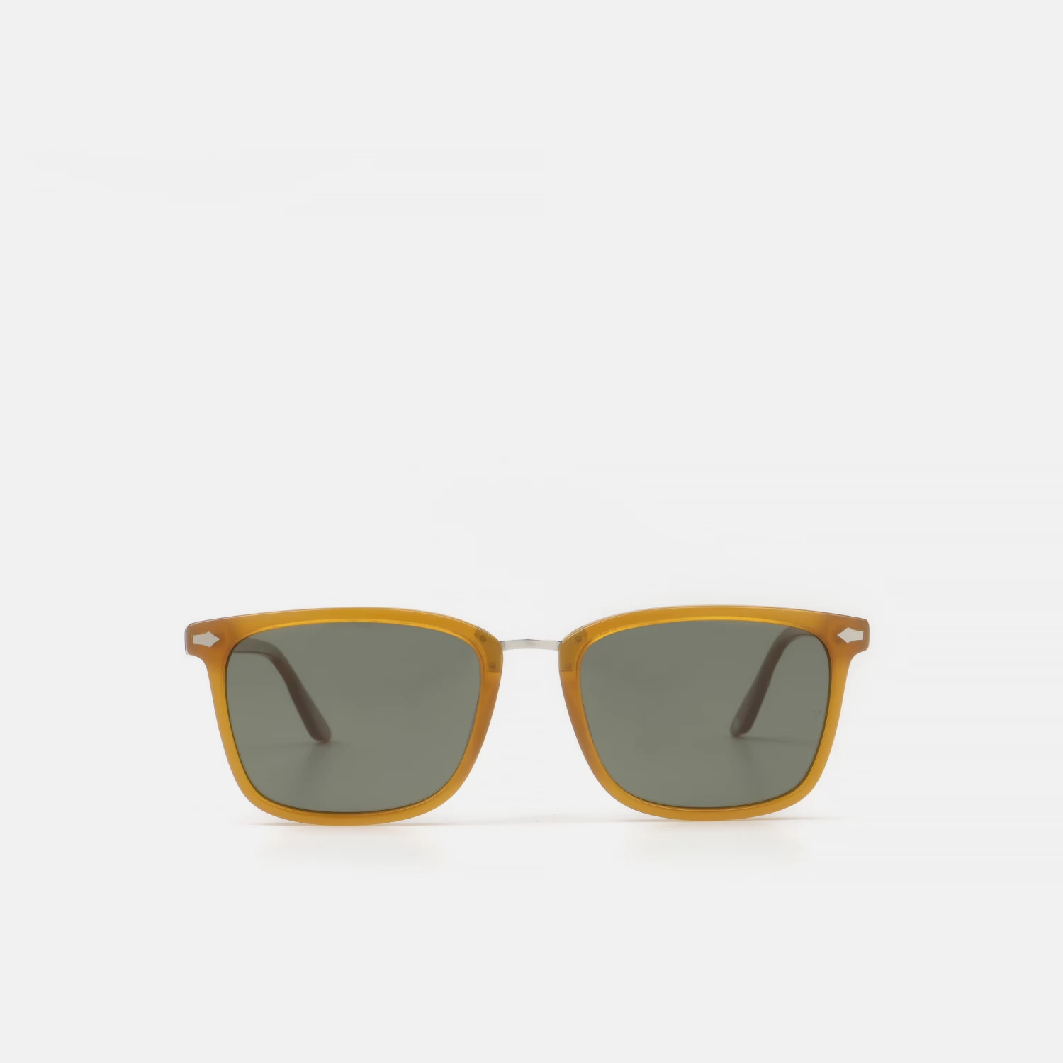 Gafas para hombre de silueta cuadrada en metal plateado y acetato color mango. Incluye detalles metálicos de color plateado en el frente y varilla. Con lentes verdes polarizadas.