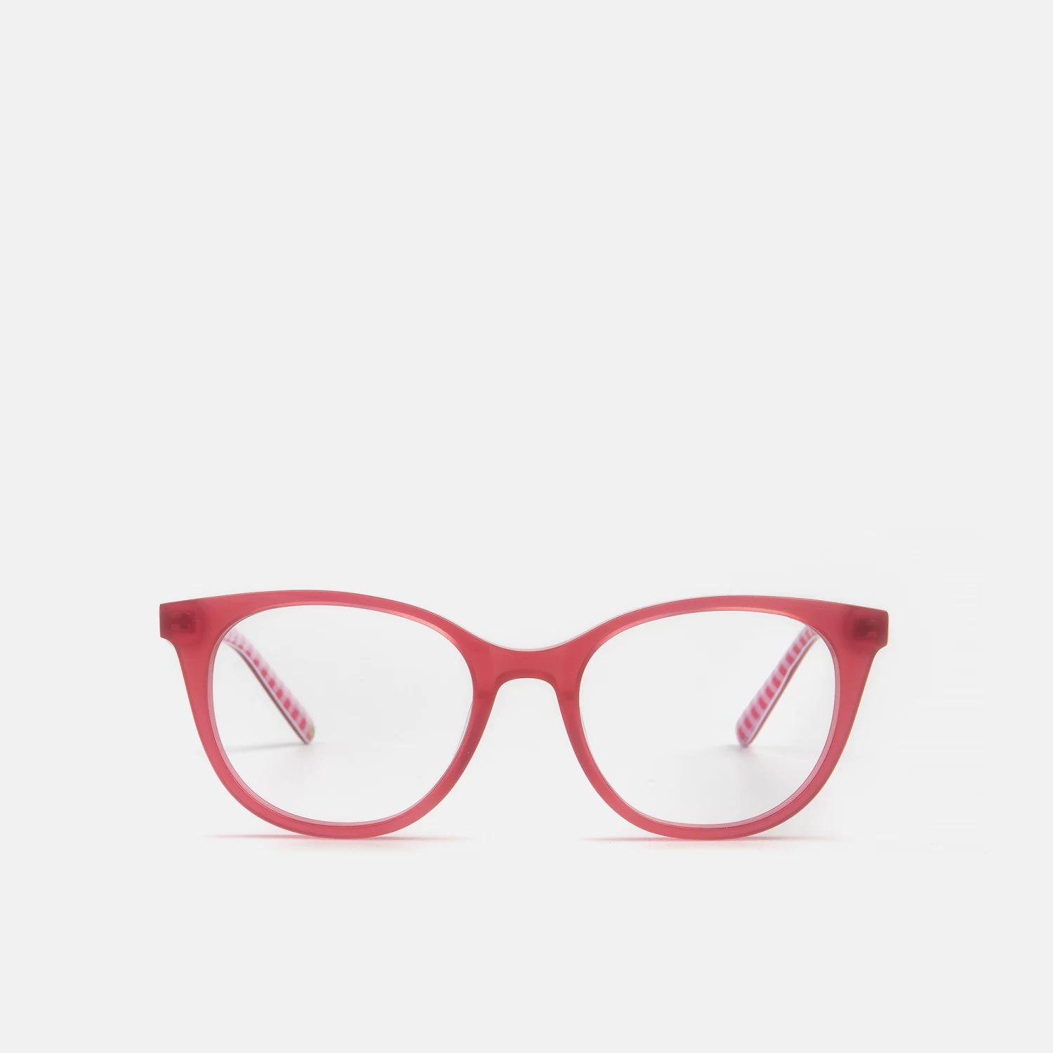 Gafas «kids» con forma cat-eye en color rosa, destaca el detalle estampado vichy en el interior de la varilla, tienen bisagra flex que aporta mayor comodidad a los más pequeños de la casa.