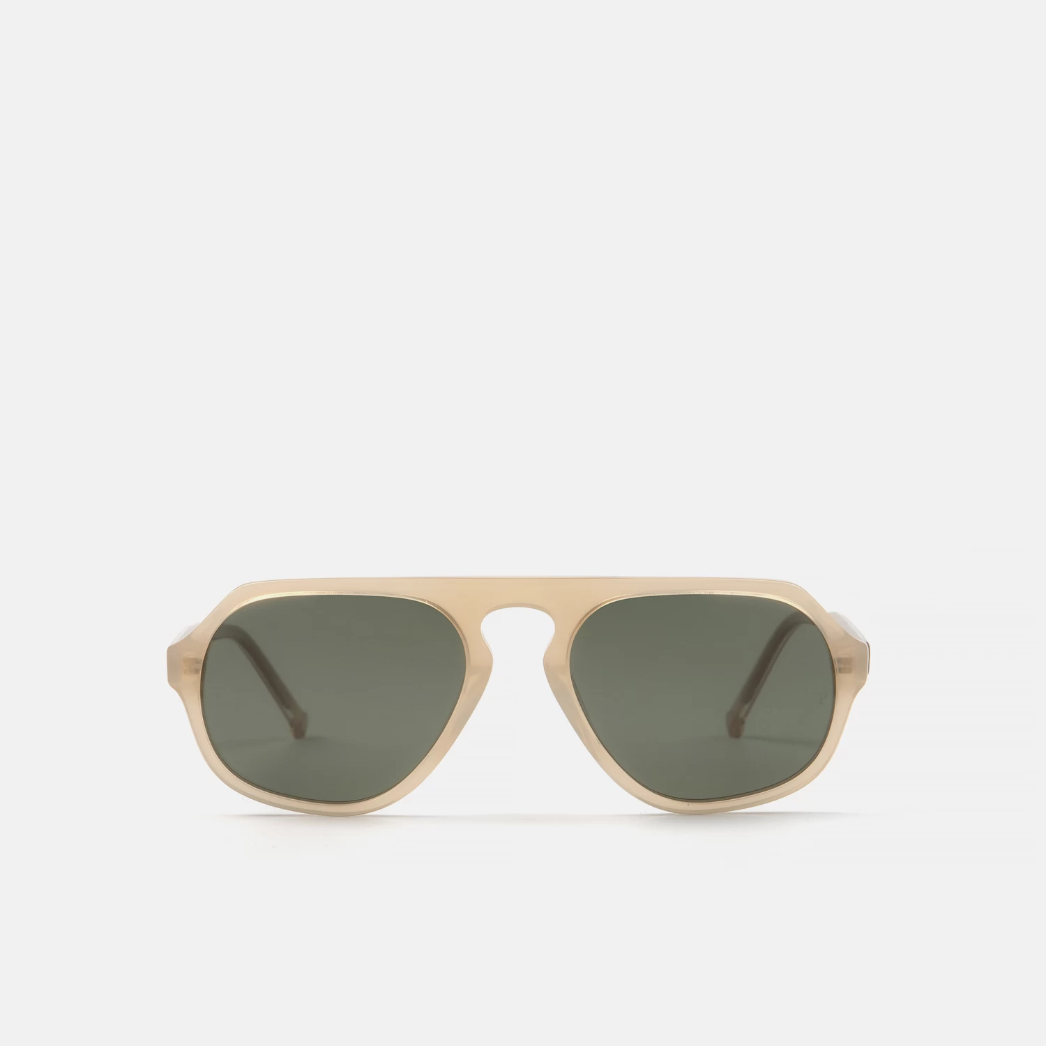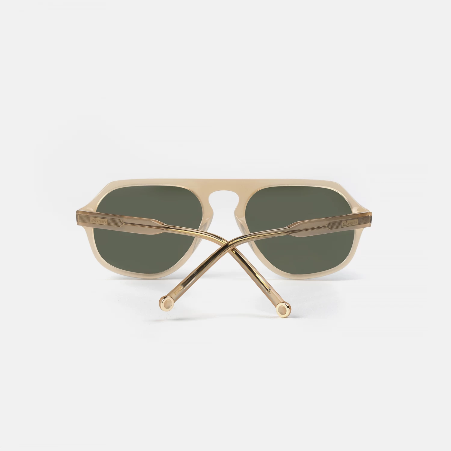 Gafas de sol, creadas en colaboración con el diseñador Juanjo Oliva. Con forma geométrica . Están fabricadas en acetato color neutro en tonos naturales color marfil, con lente verde y tratamiento polarizado para proteger tu visión.Esta montura nos recuerda a una silueta clásica retro, con detalles contemporáneos como el aro circular del final de la varilla y el alma metálica texturizada.Este modelo viene acompañado del PACK MO X OLIVA compuesto por una caja, un estuche en forma de sobre en tono negro y una gamuza a juego.